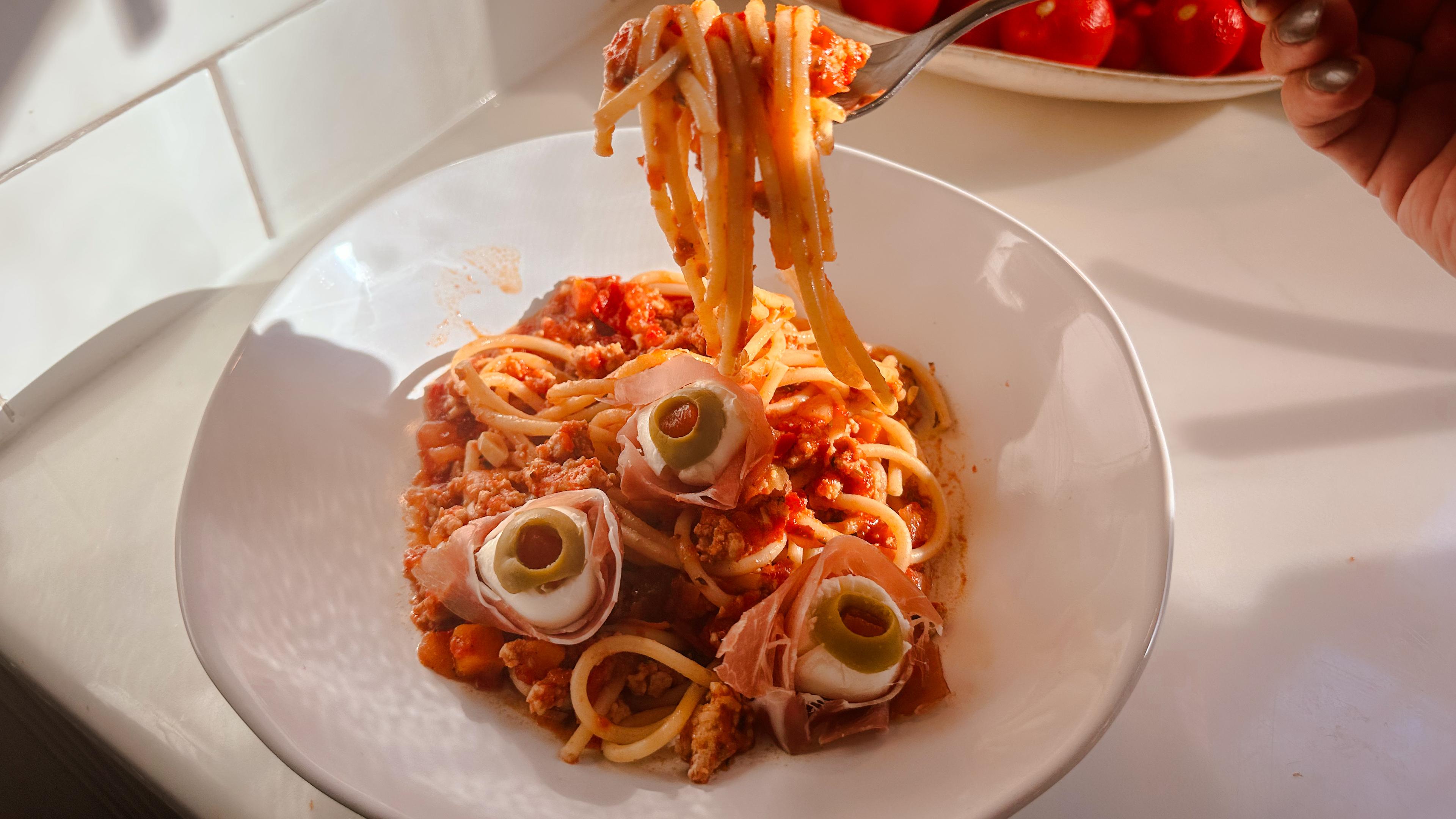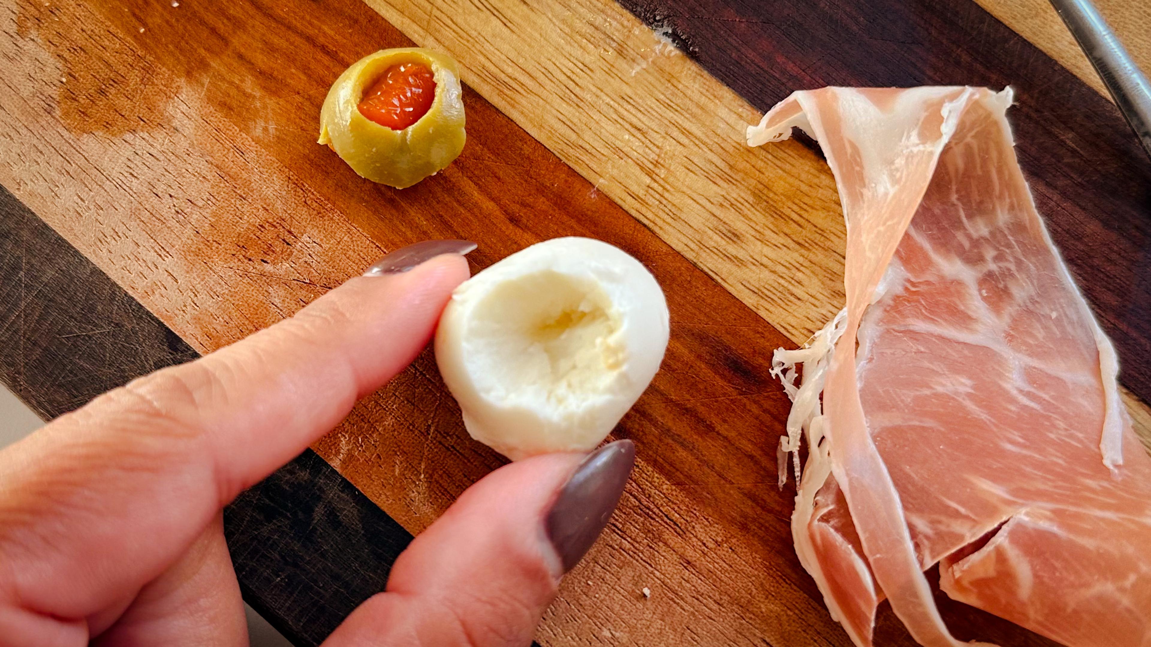 Prepare the eyeballs. Cut the olives in half. Wrap prosciutto around the cherry mozzarella ball. Carve out a small slot for the half-olive using a spoon. Place the olive in the spot.