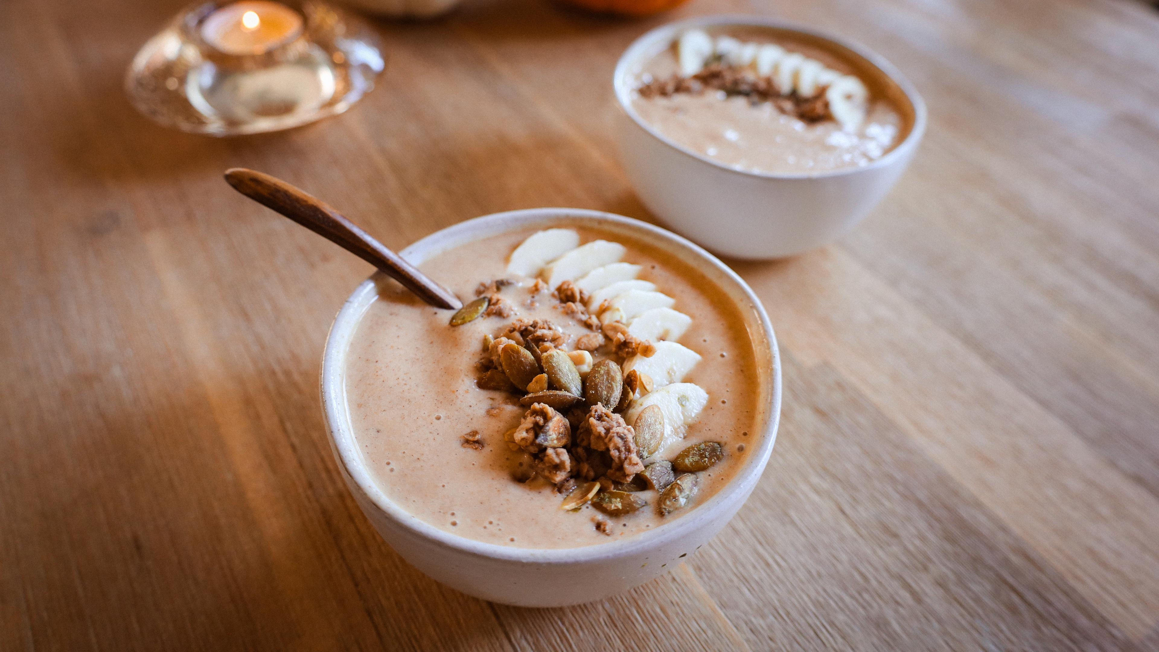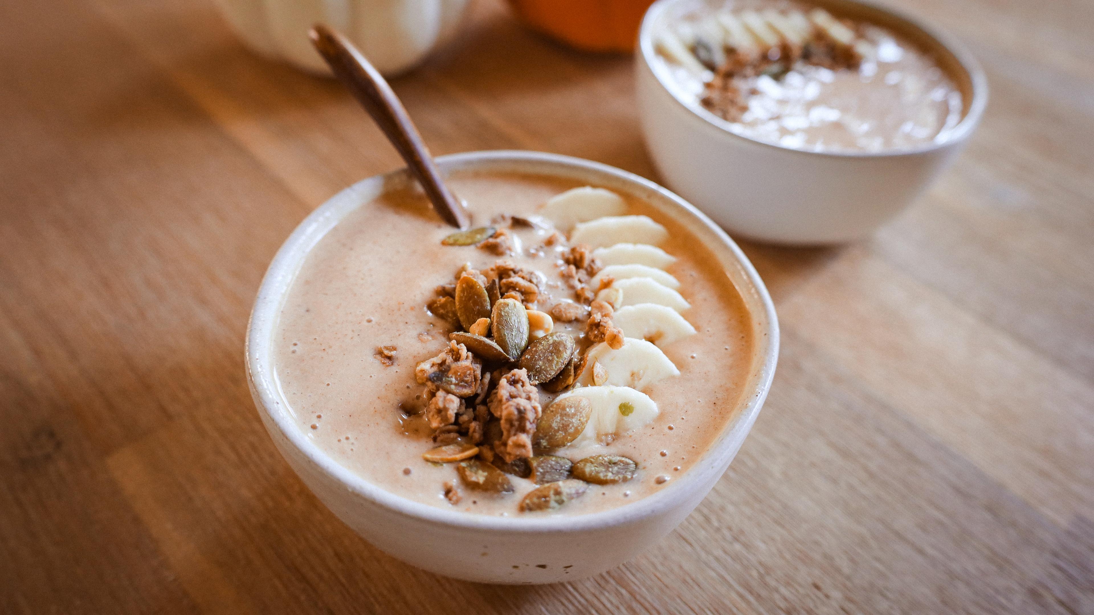This fall spiced smoothie bowl is a delicious way to start the morning.The combination of pumpkin and banana provides fiber and natural sweetness, while the toppings add healthy fats and crunch. Simply blend the ingredients and top with crunchy granola, pumpkin seeds and sliced bananas.