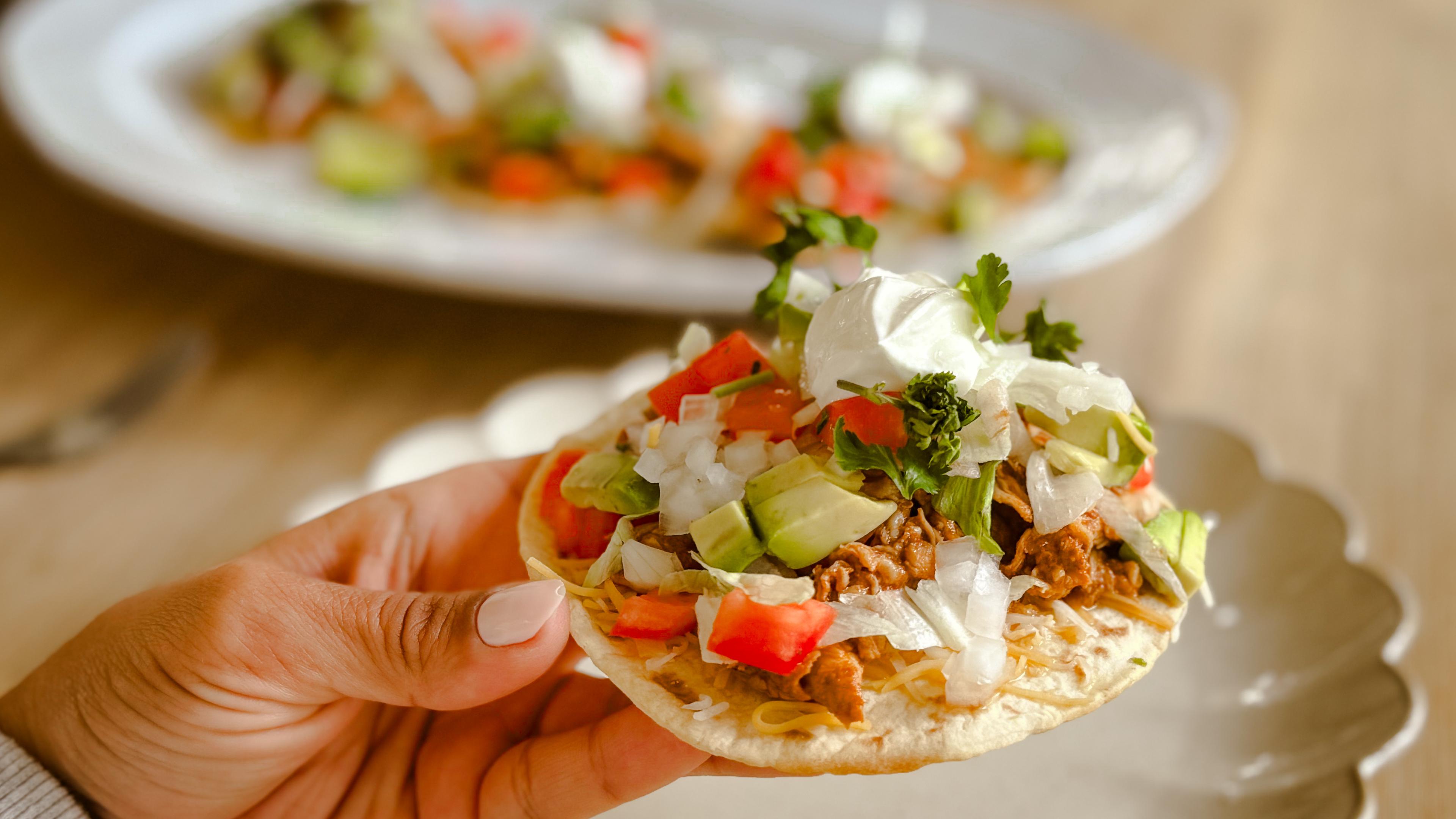 On the crispy tortilla, add shredded cheese, chicken, shredded lettuce, tomatoes, onion, avocado and cilantro. Add a dollop of sour cream if desired.
