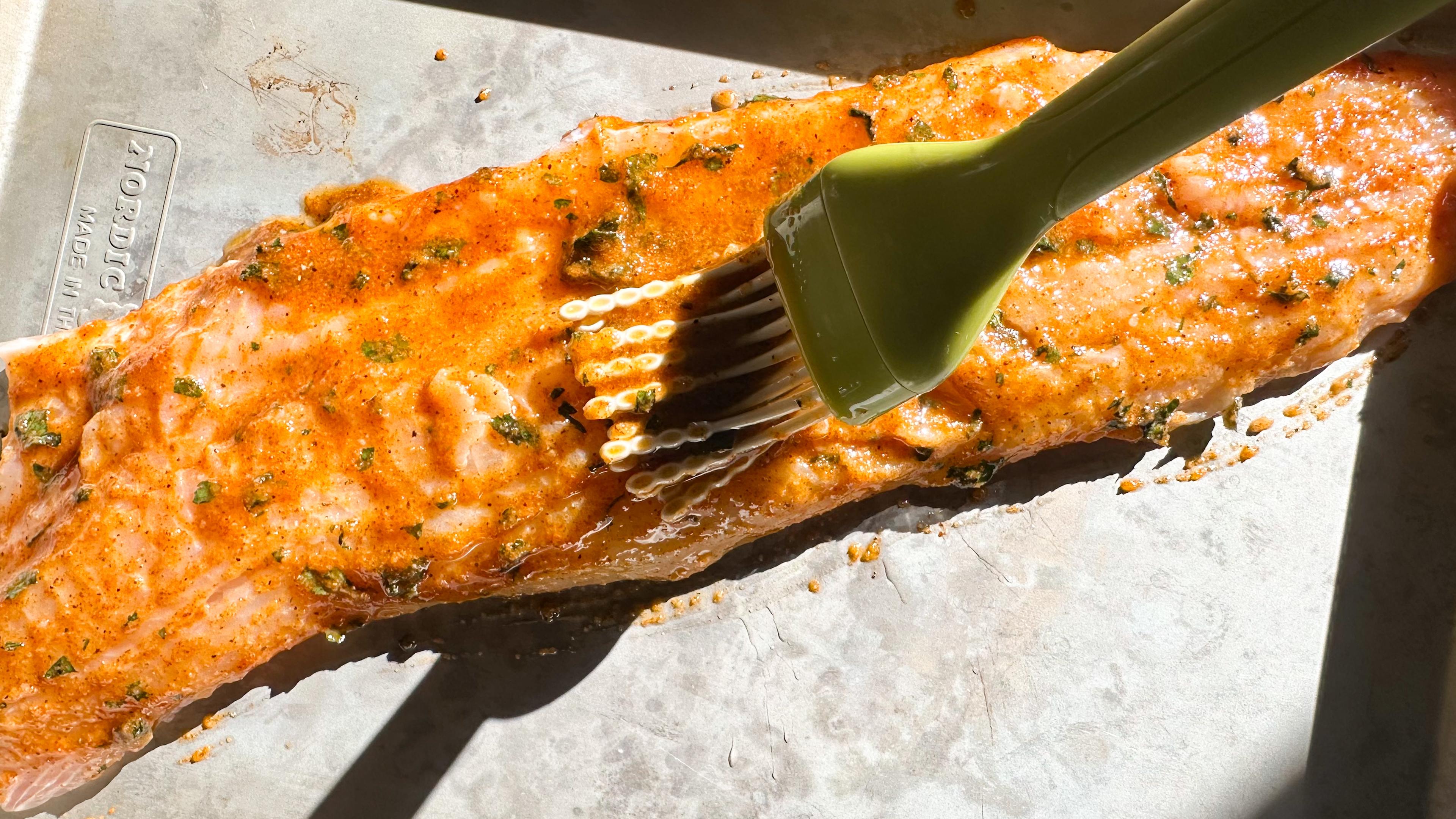 In a small bowl, whisk olive oil, juice of 1 lime, garlic, 1 tsp. honey, onion and ½ tsp. chili powder and salt. Brush over fish fillets and let sit while the grill heats.