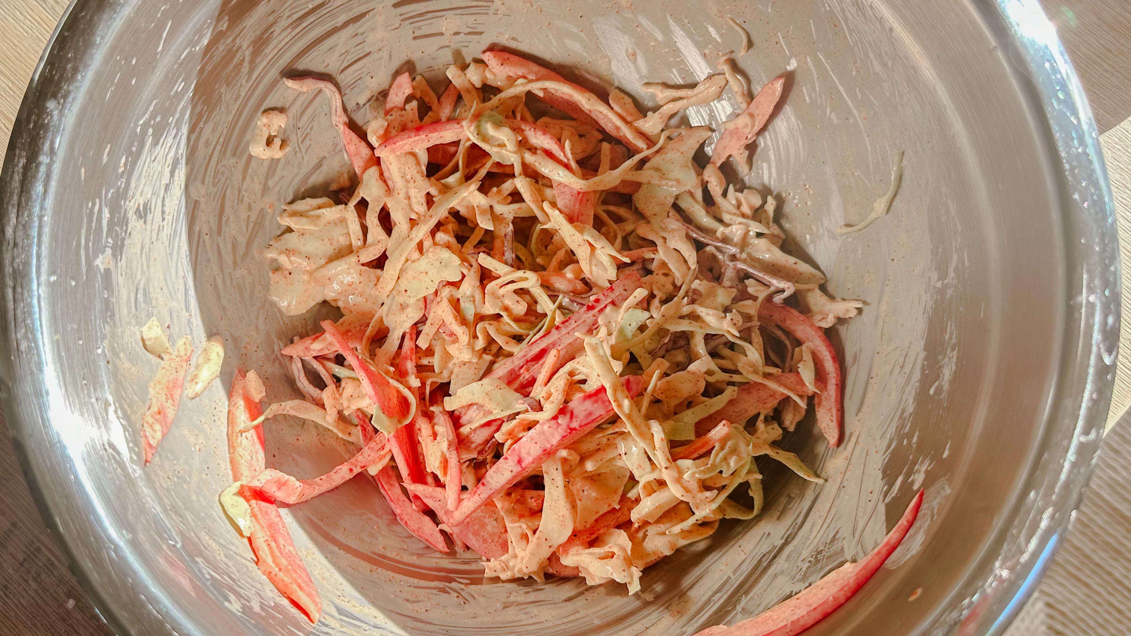 In a large bowl, combine cabbage. In a separate bowl, whisk 2 Tbsp. lime juice, 1 tsp. honey, olive oil, 1 tsp. chili powder, mayonnaise, salt and pepper. Toss dressing with the slaw mixture and set aside.