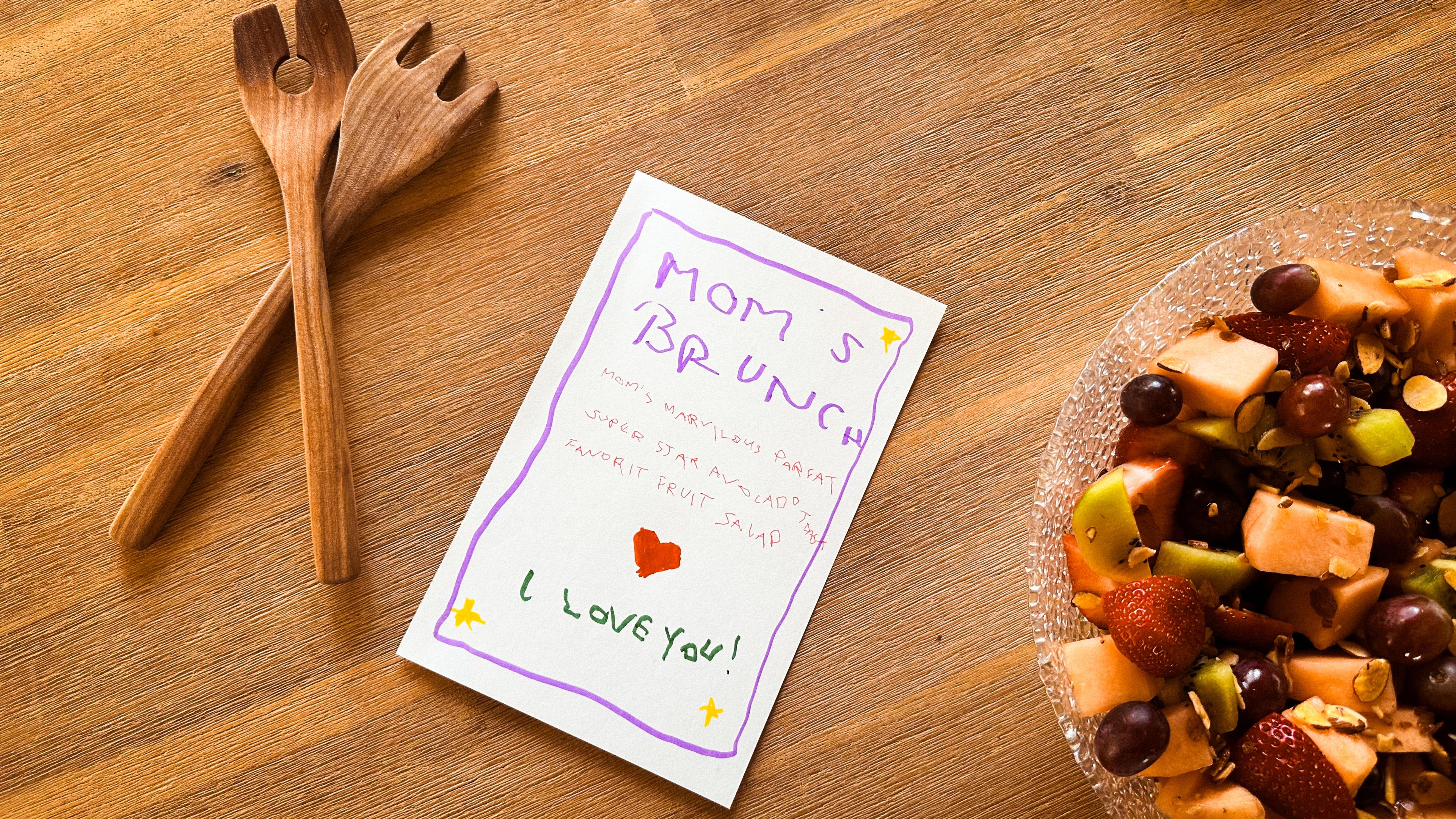 Before the cooking begins, set the mood with some thoughtful touches. Kids can design a handmade breakfast menu featuring the brunch options and give fun names to each dish, like “Mom’s Marvelous Parfait” or “Super Star Avocado Toast.”