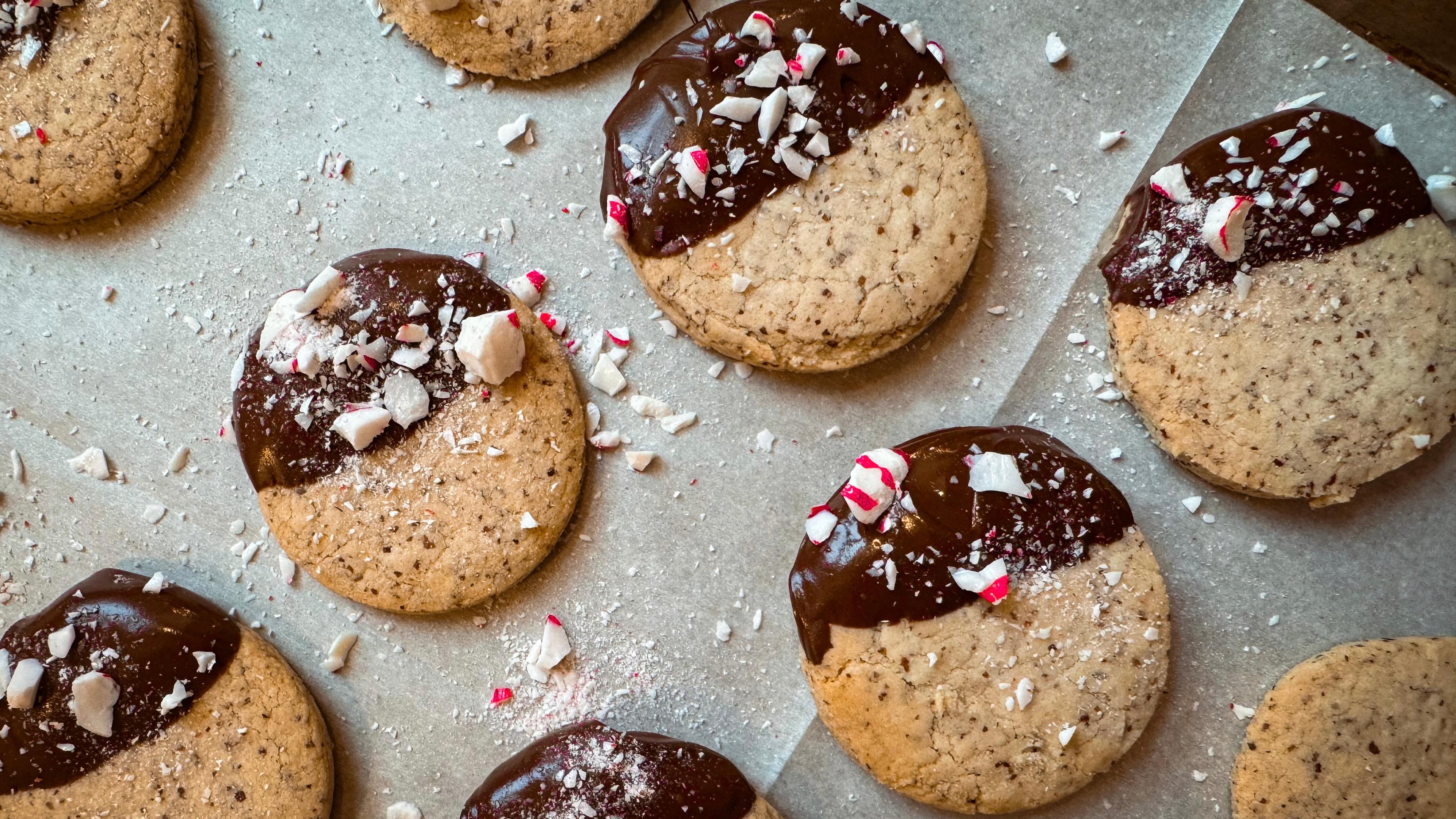 Chocolate-dipped Shortbread Cookies with Crushed Candy Canes
