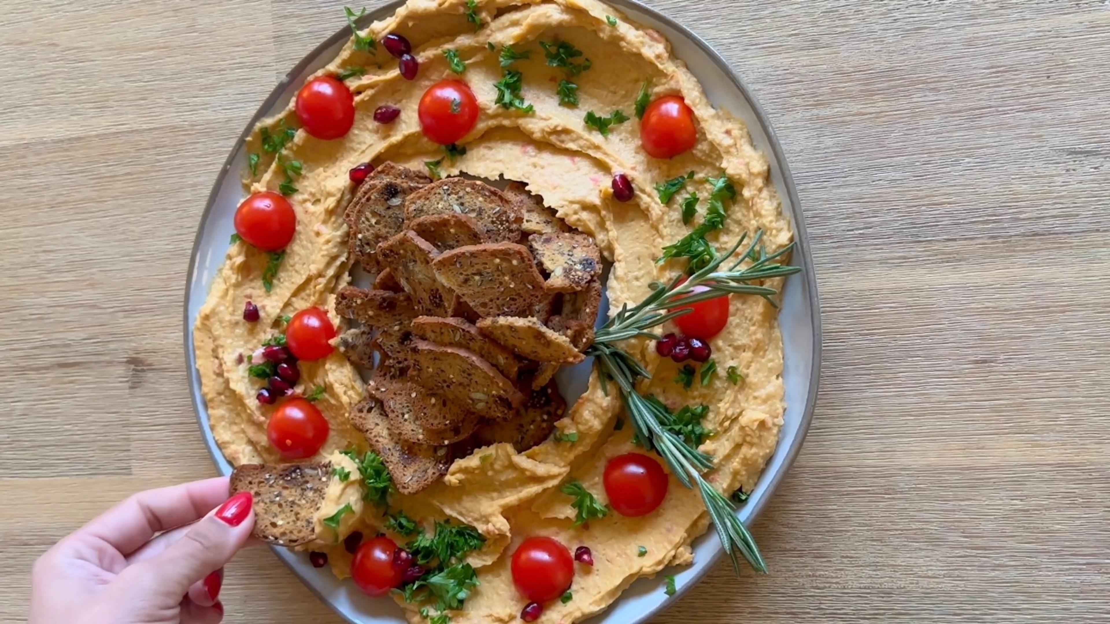 Whether you’re hosting or bringing a dish, this easy-to-make festive holiday is an eye catcher. The hummus dip is filled with healthy fats and protein to add a satisfying element. The toppings double as a nutrient punch and decorative holiday element.