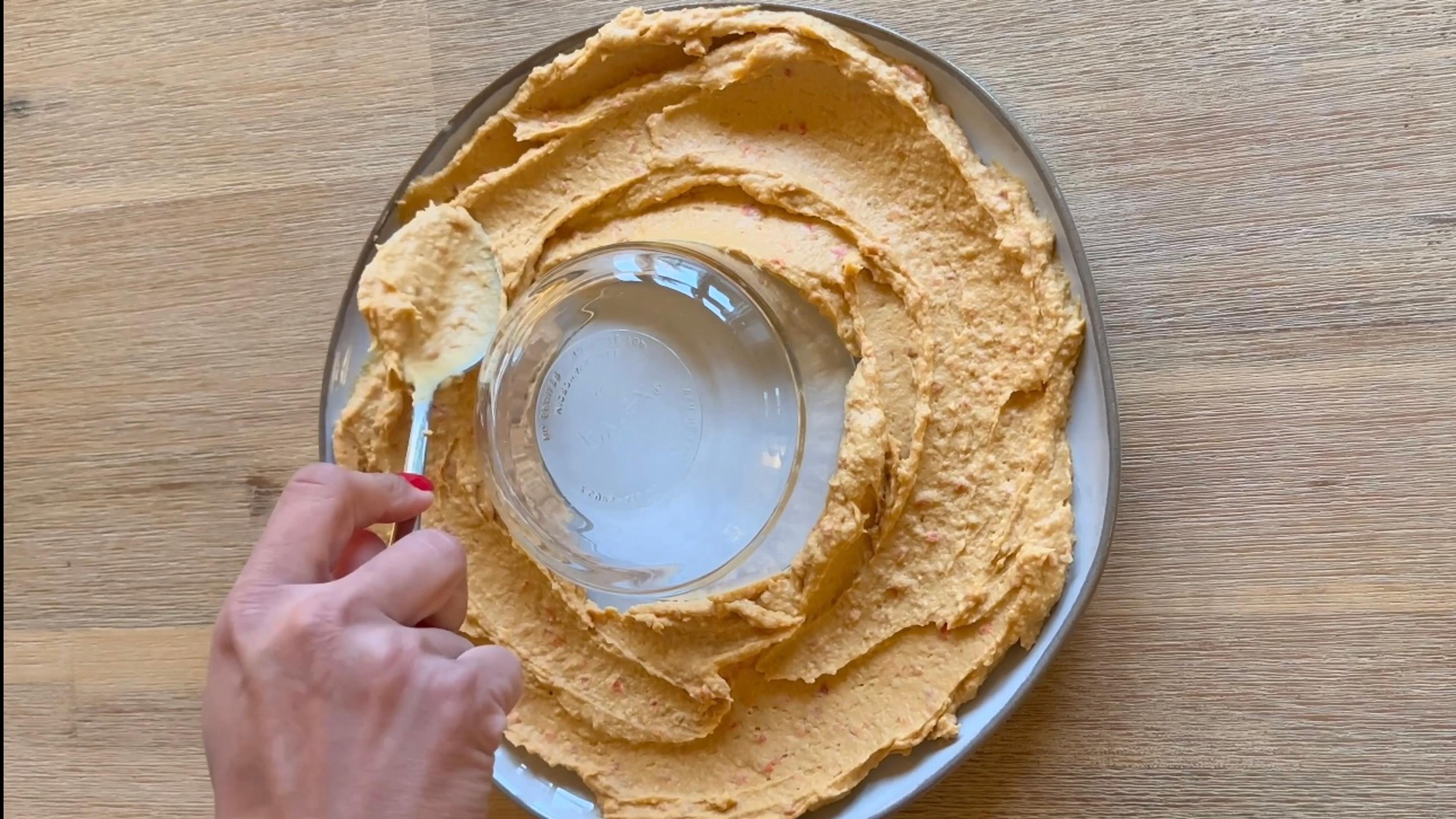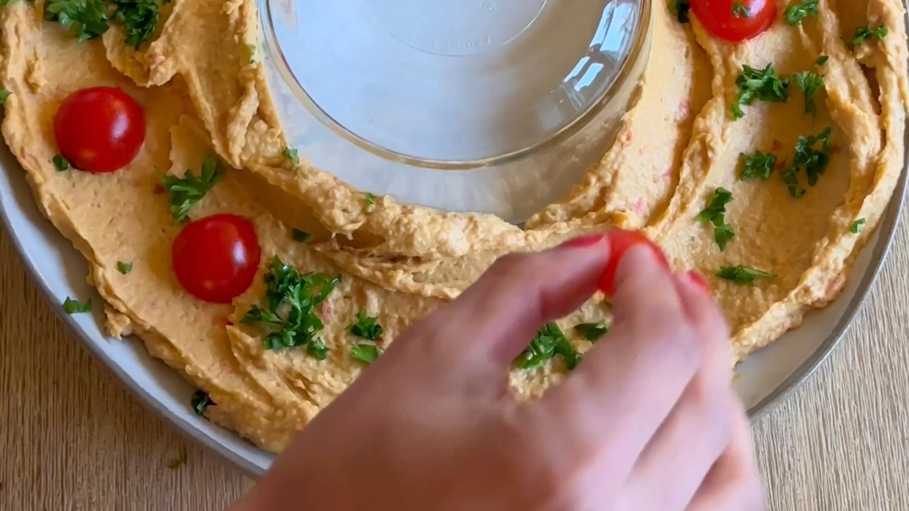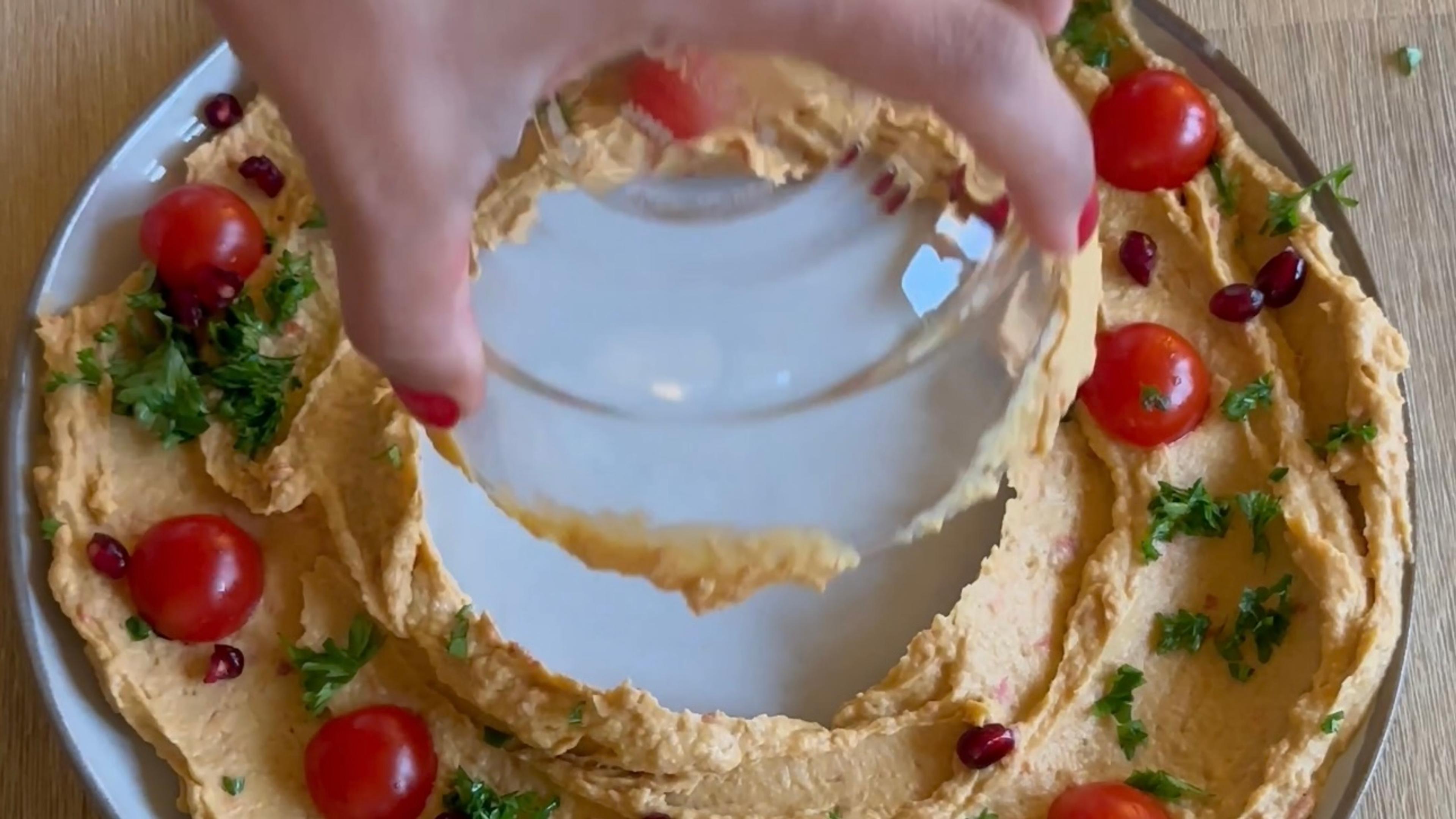 On a large serving plate, place a small to medium-sized bowl upside down in the middle, spreading hummus around the rim to the shape of a wreath.